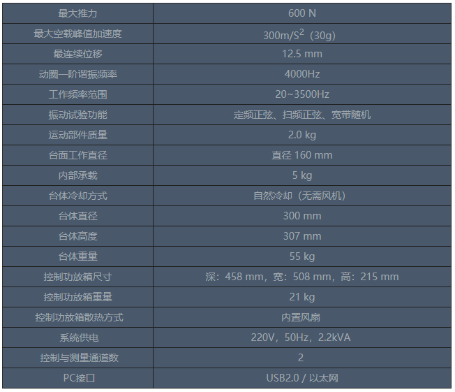 桌面上的振動臺。220V供電。自然冷卻(無需風(fēng)機)。適合2kg以下試件。正弦、隨機振動。主要技術(shù)參數(shù)表